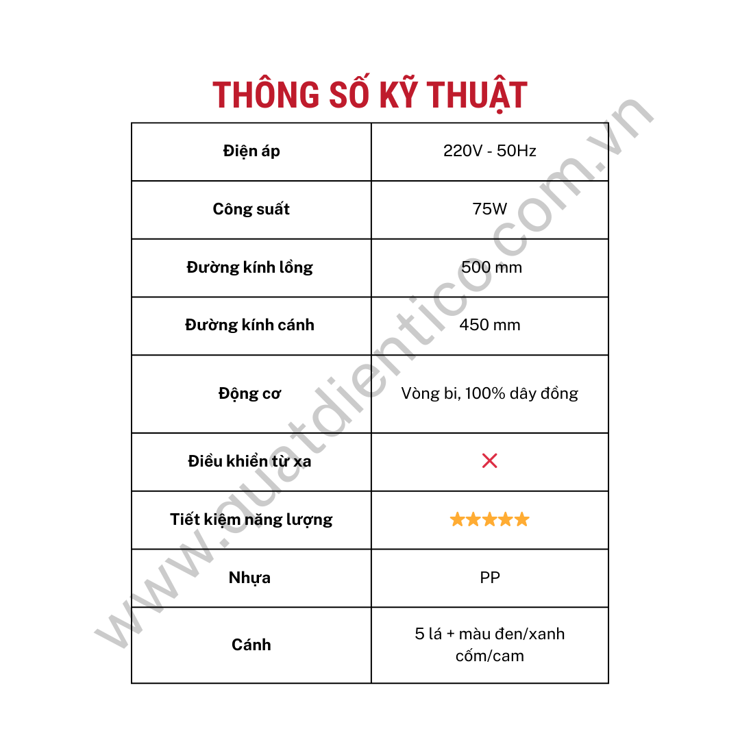 - 🔹 Đường kính cánh 450mm kết hợp đường kính lồng 500mm giúp gió thổi xa, phủ đều và mát sâu, giảm bí nóng rõ rệt.