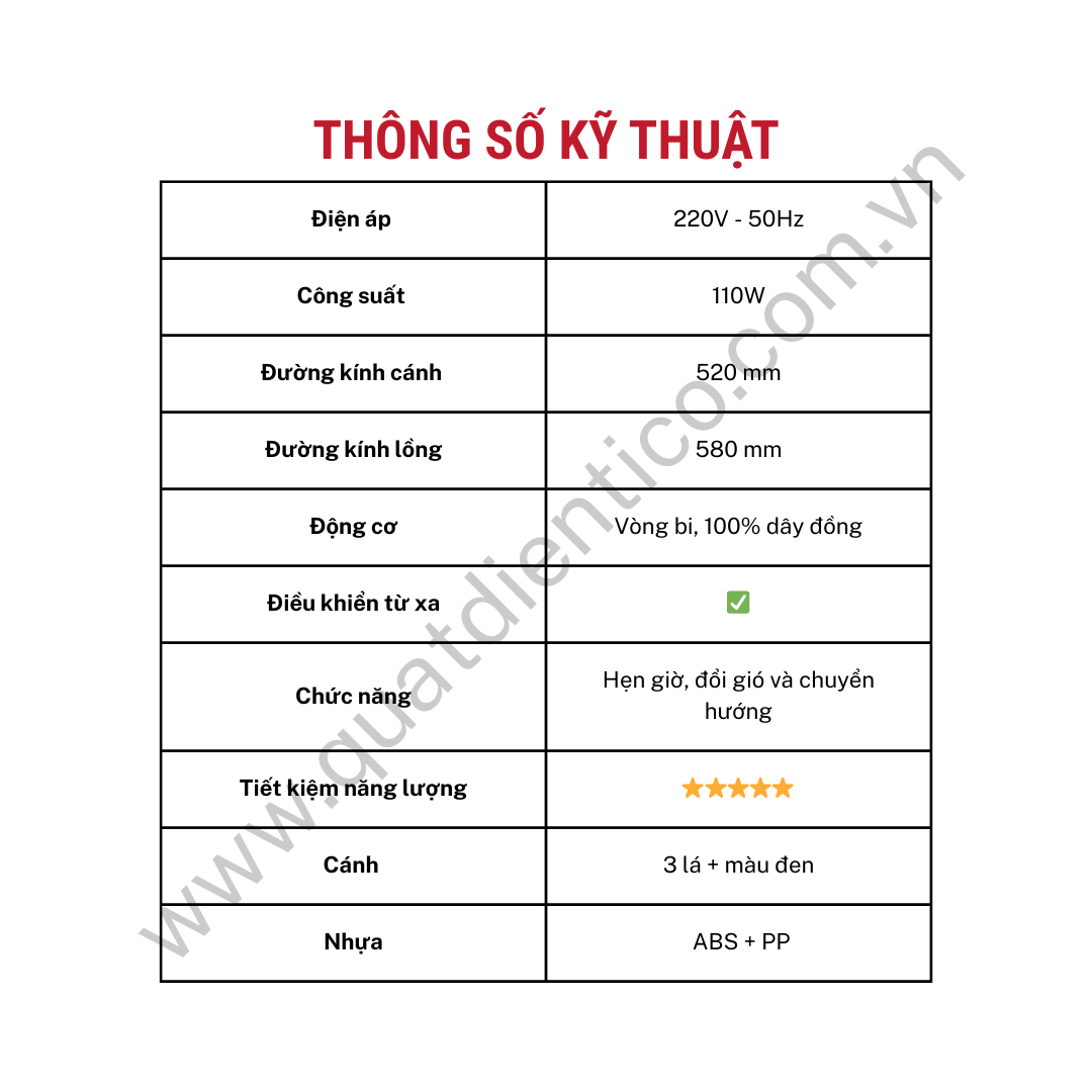 - 🔹 Công suất 110W, sải cánh 520mm, đường kính lồng 580mm cho luồng gió mạnh, phù hợp không gian rộng.