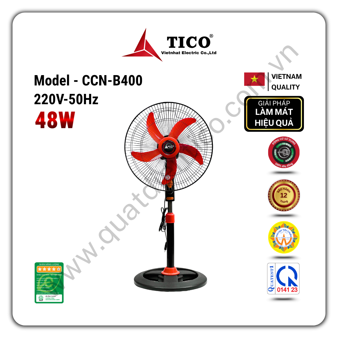 - Quạt cây công nghiệp TICO CCN-B400 với công suất 48W, phù hợp cho nhu cầu làm mát mạnh nhưng vẫn tiết kiệm điện cho gia đình, cửa hàng và các không gian làm việc nhỏ.