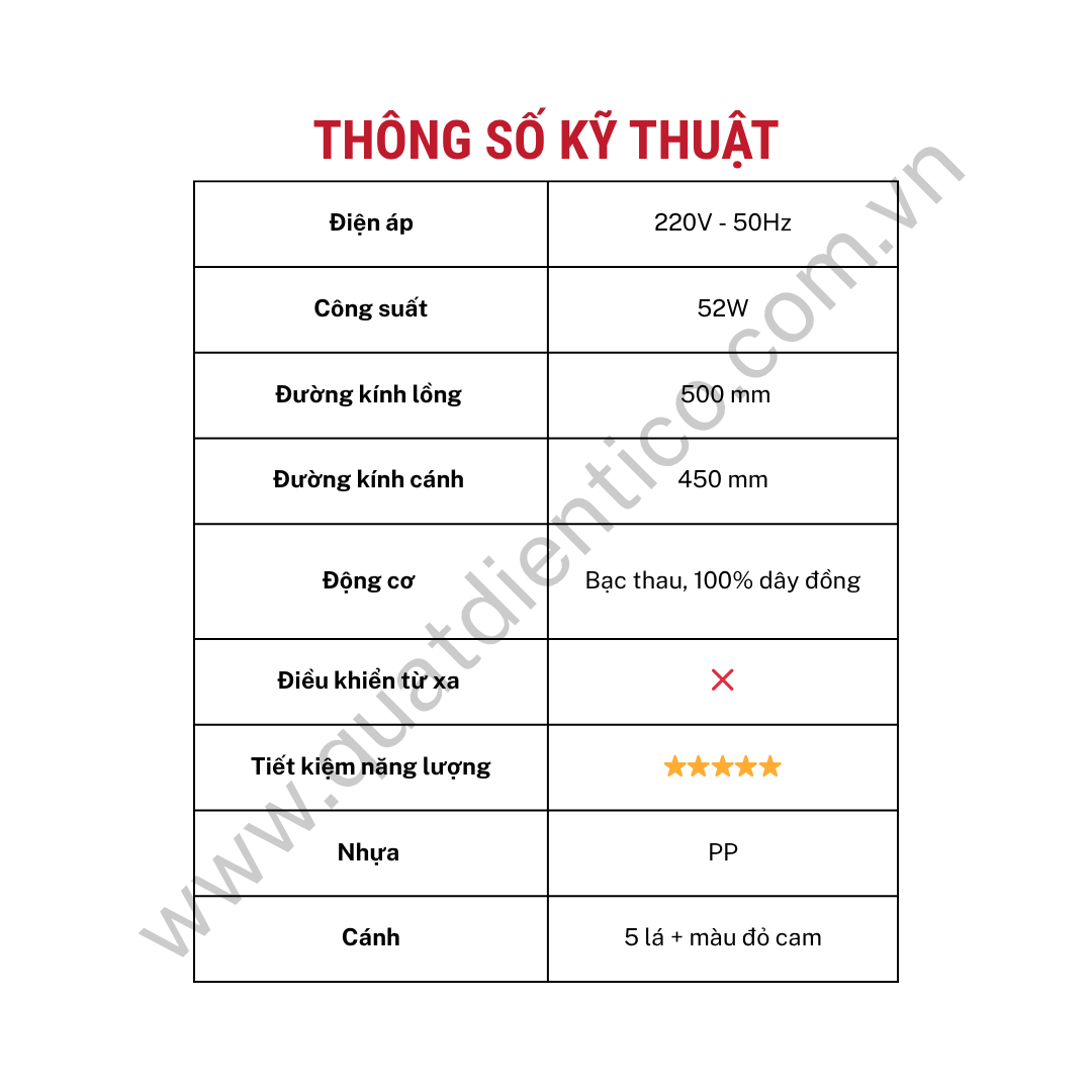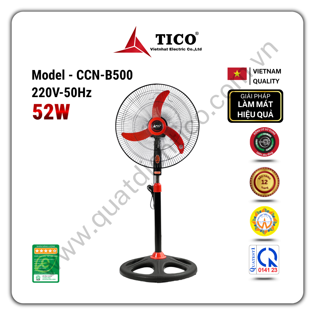 - Quạt cây công nghiệp TICO CCN-B500 sở hữu công suất 52W, cho luồng gió mạnh và ổn định, phù hợp sử dụng trong gia đình, cửa hàng, quầy dịch vụ và xưởng nhỏ.