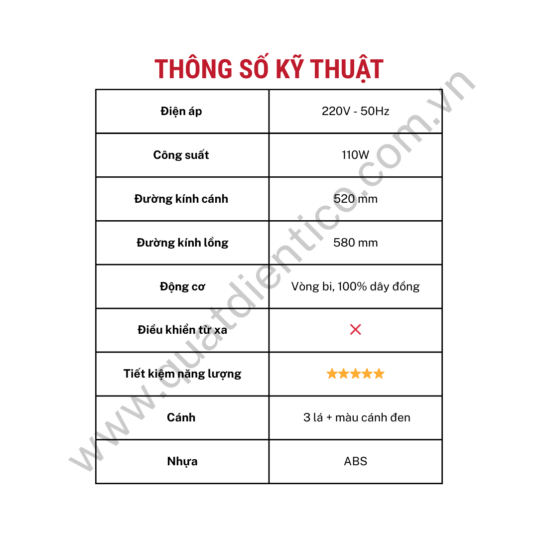 - 🔹 Sải cánh 520mm, đường kính lồng 580mm giúp luồng gió rộng và mát sâu, hỗ trợ lưu thông không khí tốt hơn trong các khu vực rộng.