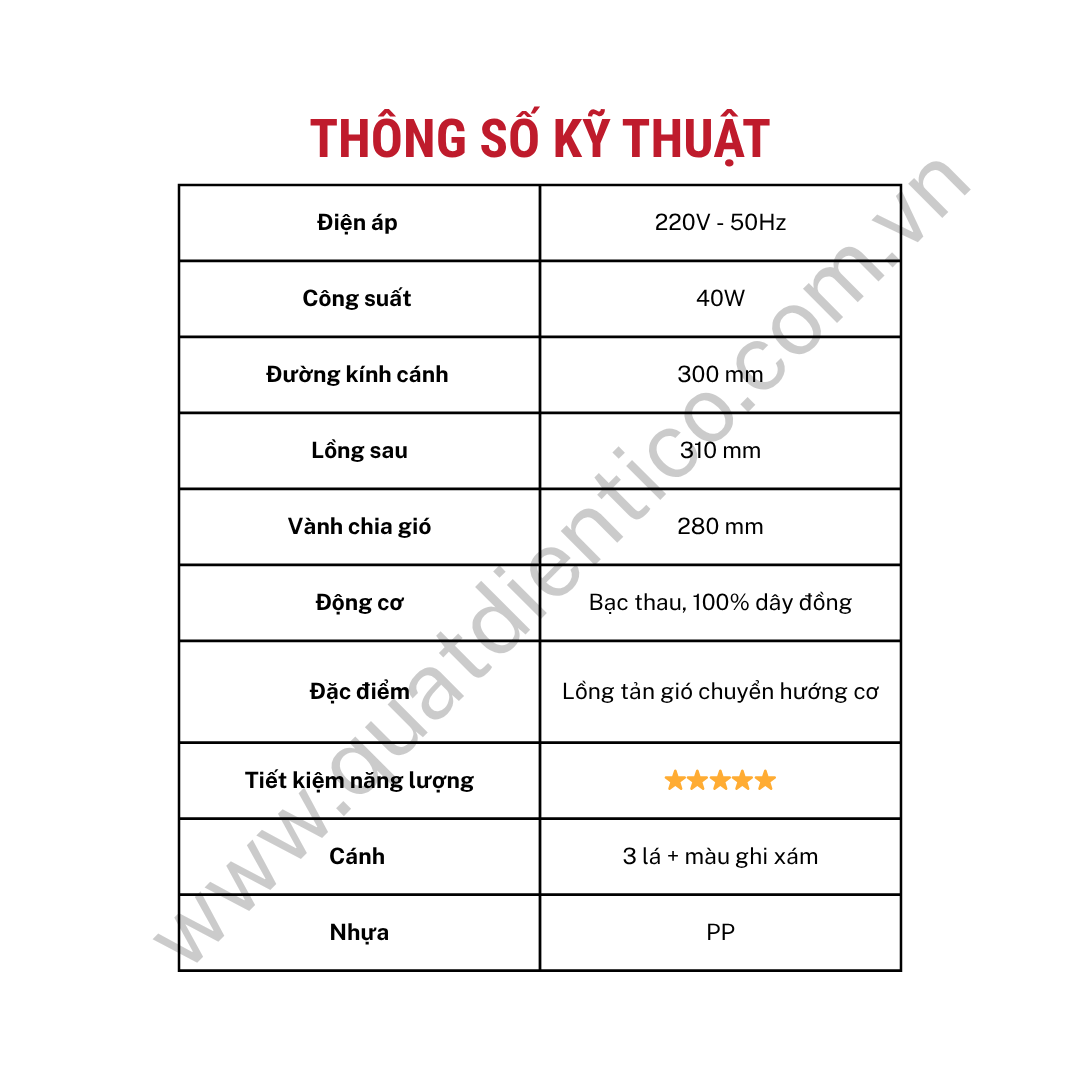 - Công suất 40W kết hợp cánh quạt 300mm giúp tạo gió mạnh, thoáng mát và tiết kiệm điện.