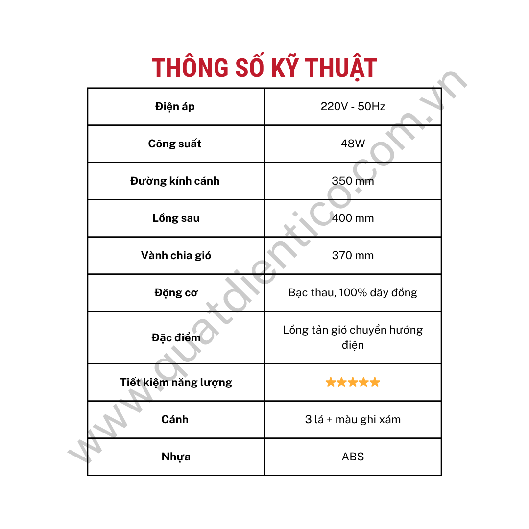 - Công suất 48W kết hợp đường kính cánh 350mm giúp tạo luồng gió mát ổn định, phù hợp sử dụng hằng ngày.
