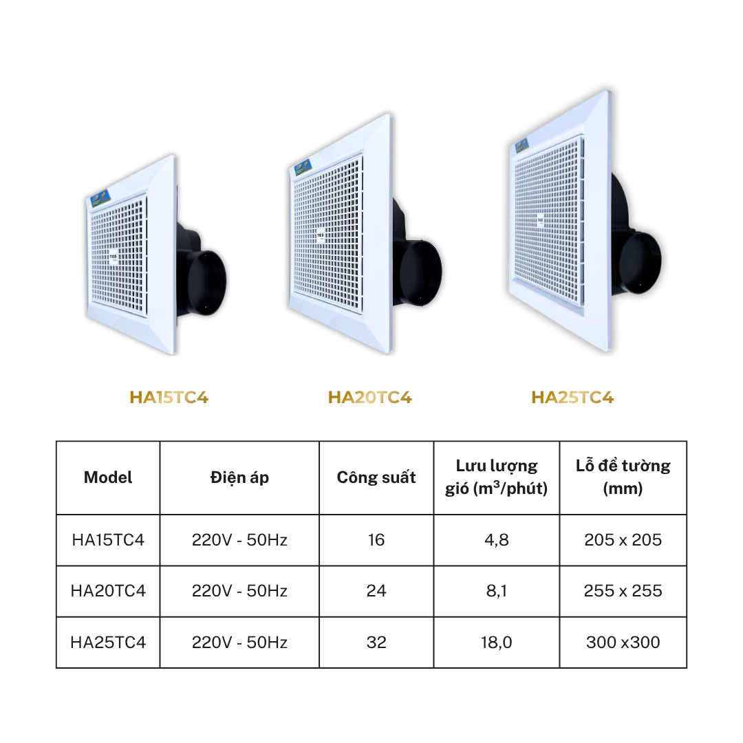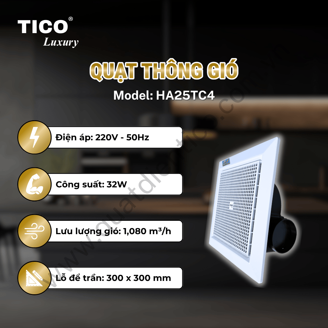 - Thông gió hút ngang TICO Luxury HA25TC4 là mẫu quạt thông gió âm trần cao cấp, thiết kế mặt lưới vuông sang trọng, phù hợp cho các không gian yêu cầu thẩm mỹ cao như nhà ở, căn hộ, văn phòng, khách sạn.