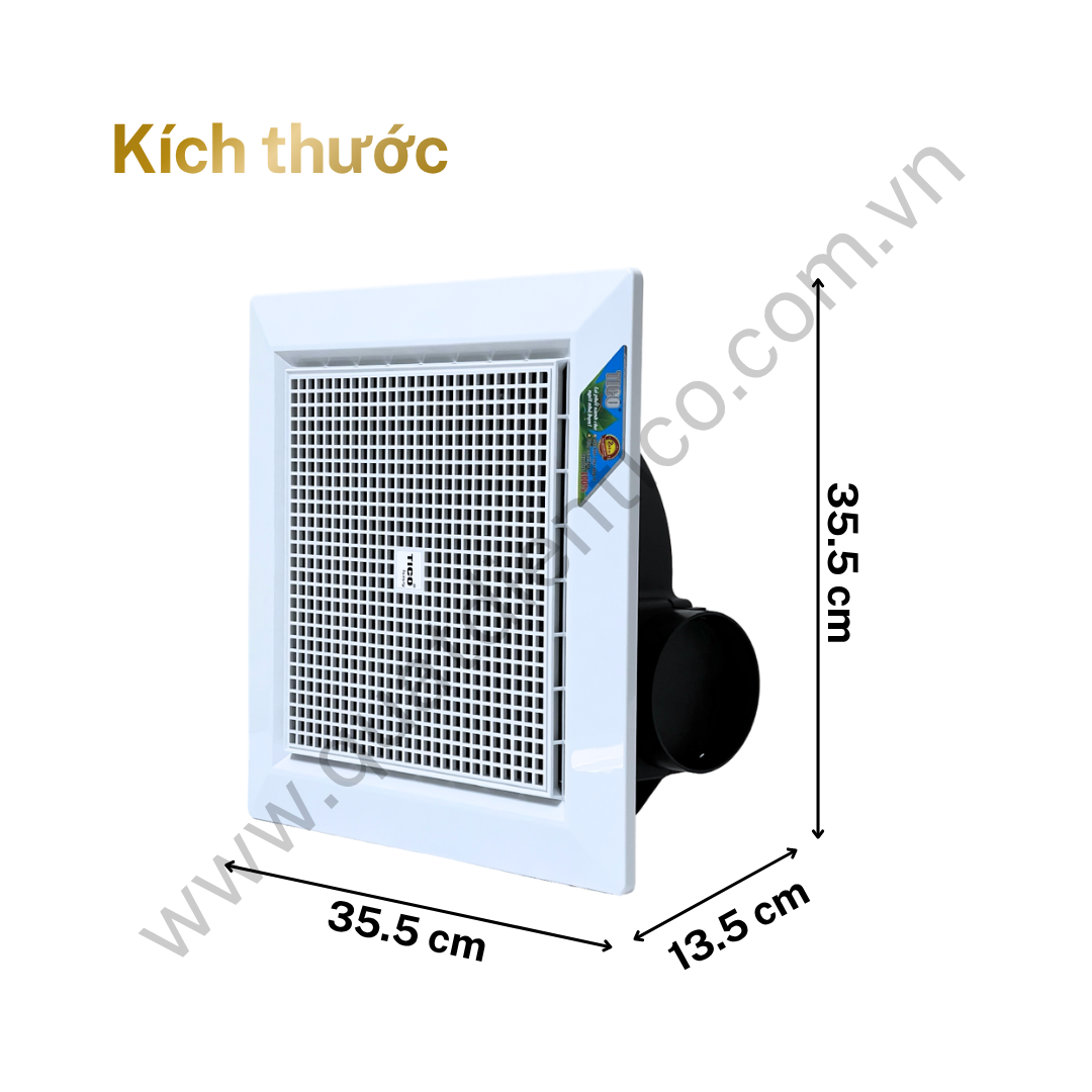 - Kích thước mặt 355 x 355 mm, lỗ trần 300 x 300 mm, lắp âm trần gọn gàng, tối ưu cho những phòng có trần thạch cao, trần bê tông hoặc trần gỗ cần giải pháp thông gió ẩn.