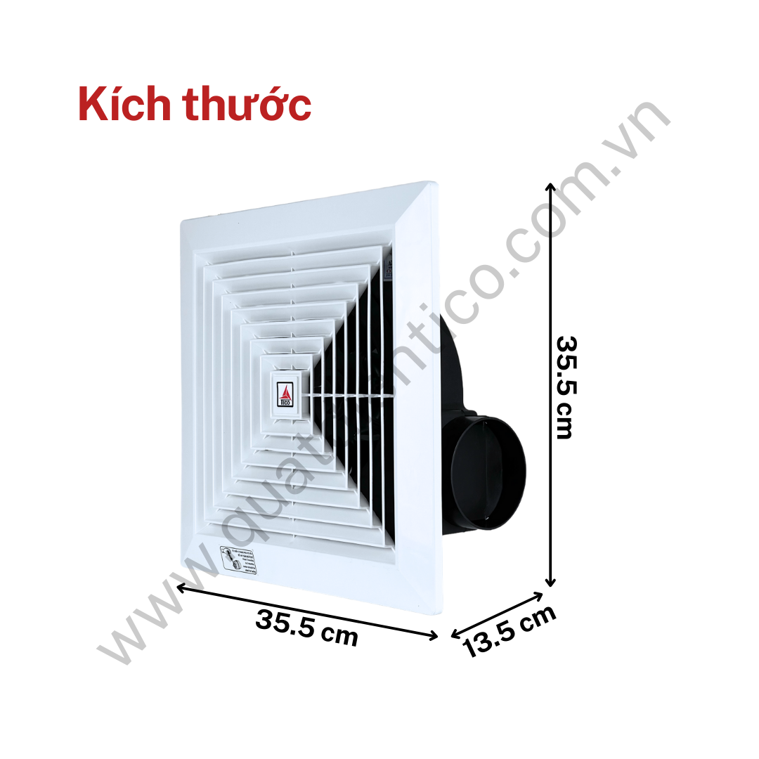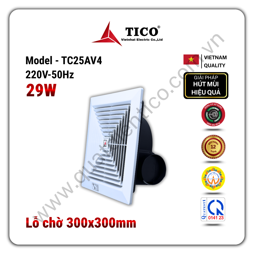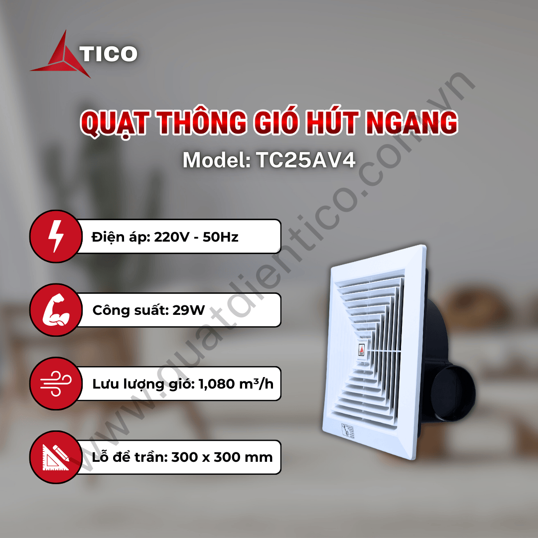 - Thông gió hút ngang TICO TC25AV4 là quạt thông gió âm trần hút ngang kích thước trung, phù hợp cho không gian có nhu cầu lưu lượng gió cao hơn các model 15 và 20.
