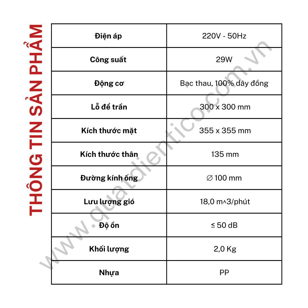 - Công suất 29W, lưu lượng gió 18,0 m³/phút (1080 m³/h), đáp ứng tốt cho các phòng có diện tích sử dụng 25–30 m².