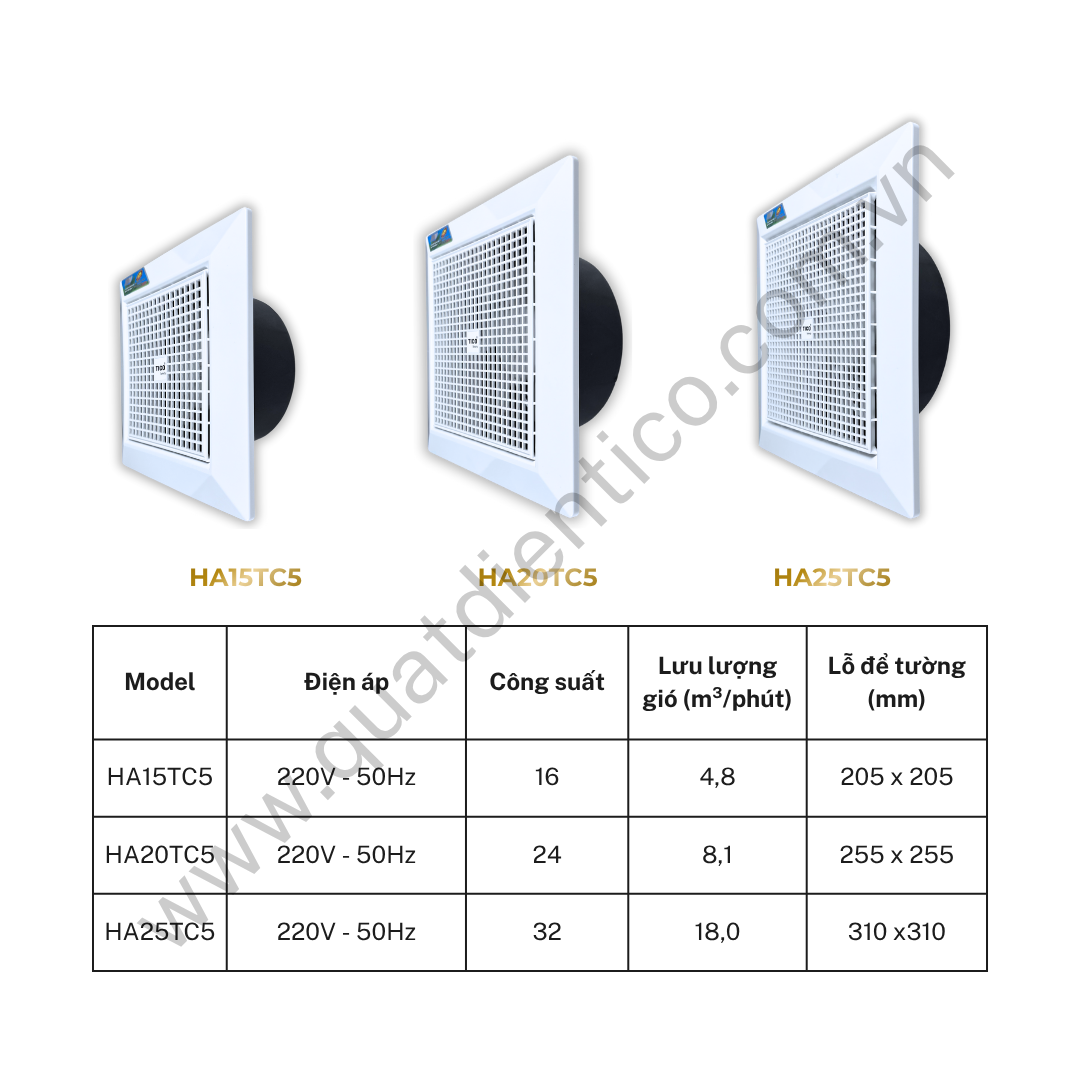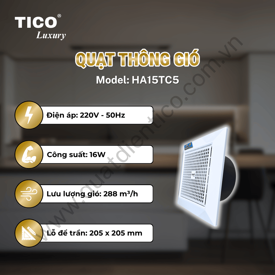 - Thông gió hút thẳng TICO Luxury HA15TC5 là dòng quạt thông gió âm trần hút thẳng cao cấp, thiết kế mặt lưới vuông nhỏ gọn, hiện đại, phù hợp cho nhiều không gian nội thất.