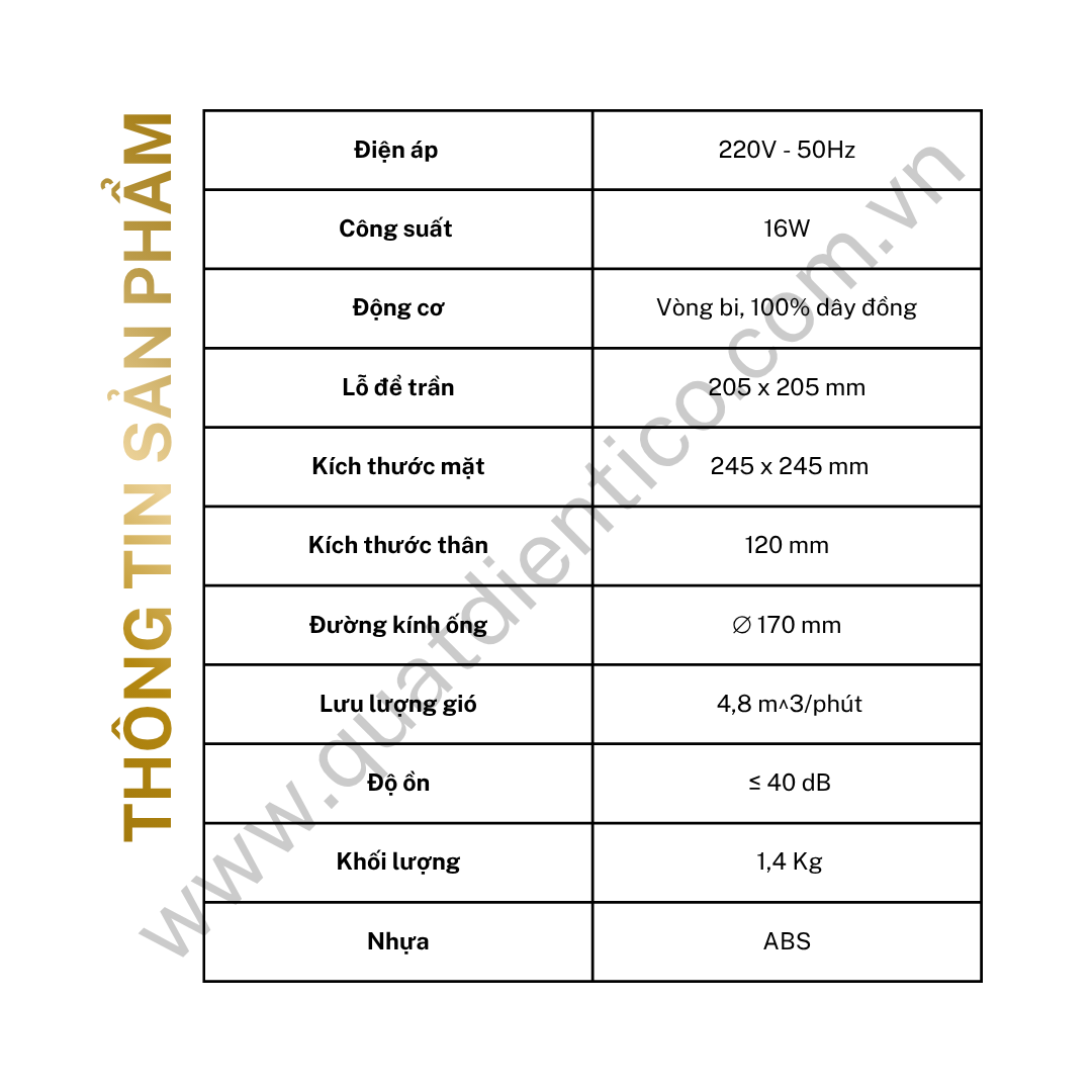 - Công suất 16W, lưu lượng gió 4,8 m³/phút (288 m³/h), đáp ứng tốt nhu cầu thông gió cho không gian từ 15–20 m² mà vẫn tiết kiệm điện.