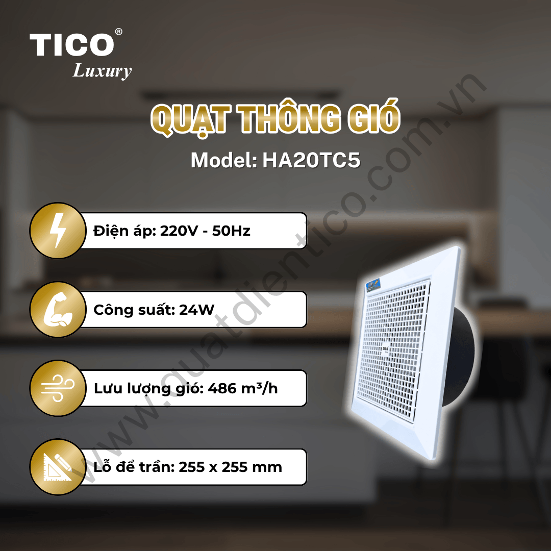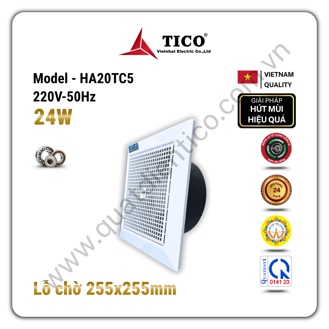 - Thông gió hút thẳng TICO Luxury HA20TC5 là dòng quạt thông gió âm trần hút thẳng cao cấp, thiết kế mặt lưới vuông nhỏ gọn, tạo điểm nhấn sang trọng cho không gian lắp đặt.