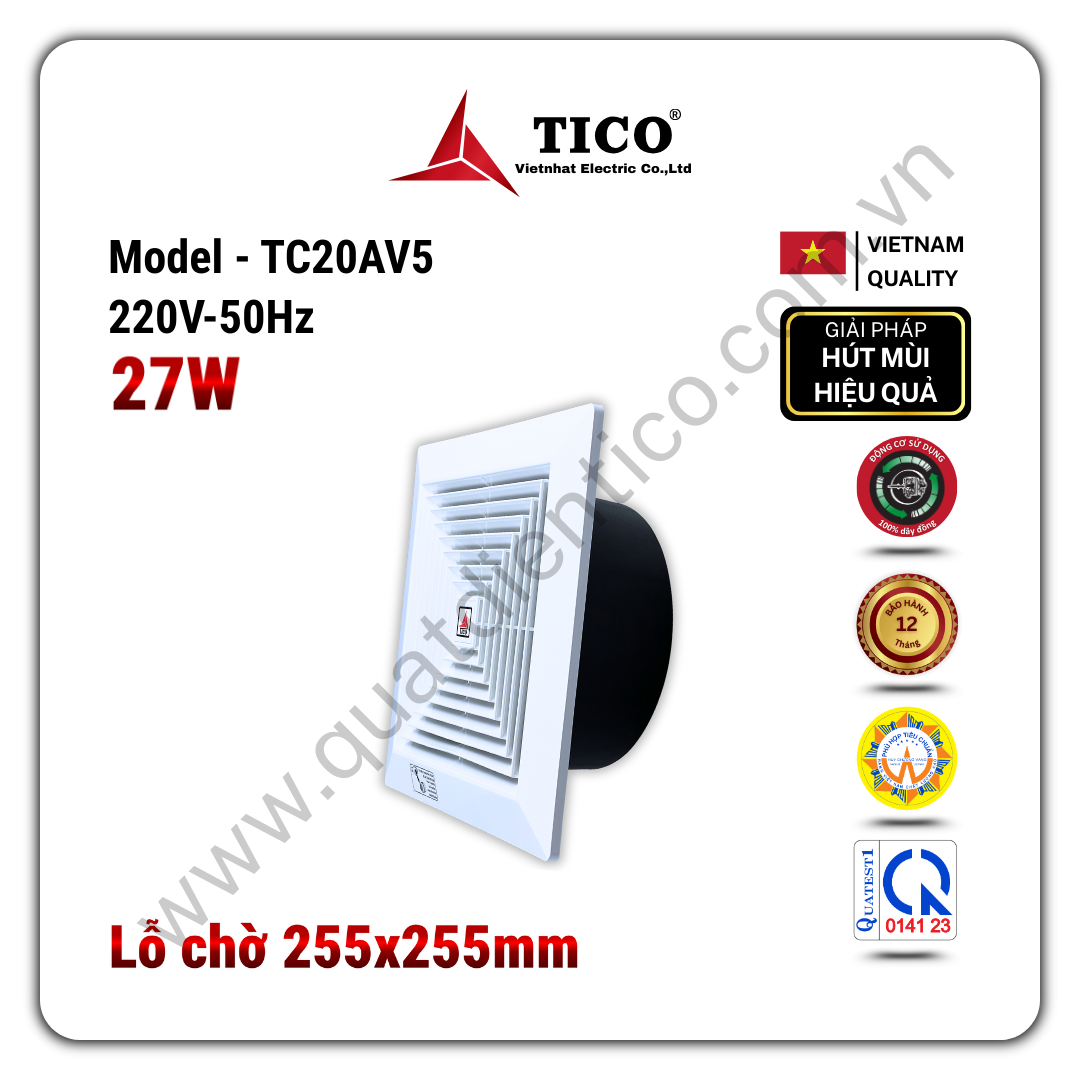 - Thông gió hút thẳng TICO TC20AV5 là dòng quạt thông gió âm trần truyền thống, thiết kế mặt lưới vuông đơn giản, dễ phối với nhiều kiểu trần và không gian nội thất.