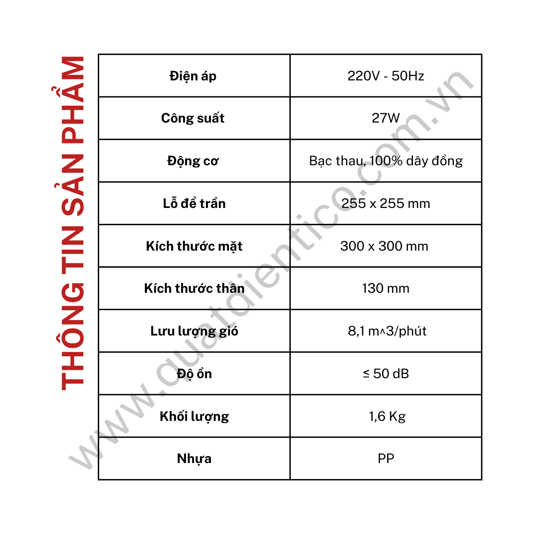 - Công suất 27W, lưu lượng gió 8,1 m³/phút (486 m³/h), đáp ứng tốt nhu cầu thông gió cho các phòng có diện tích từ 20–25 m².