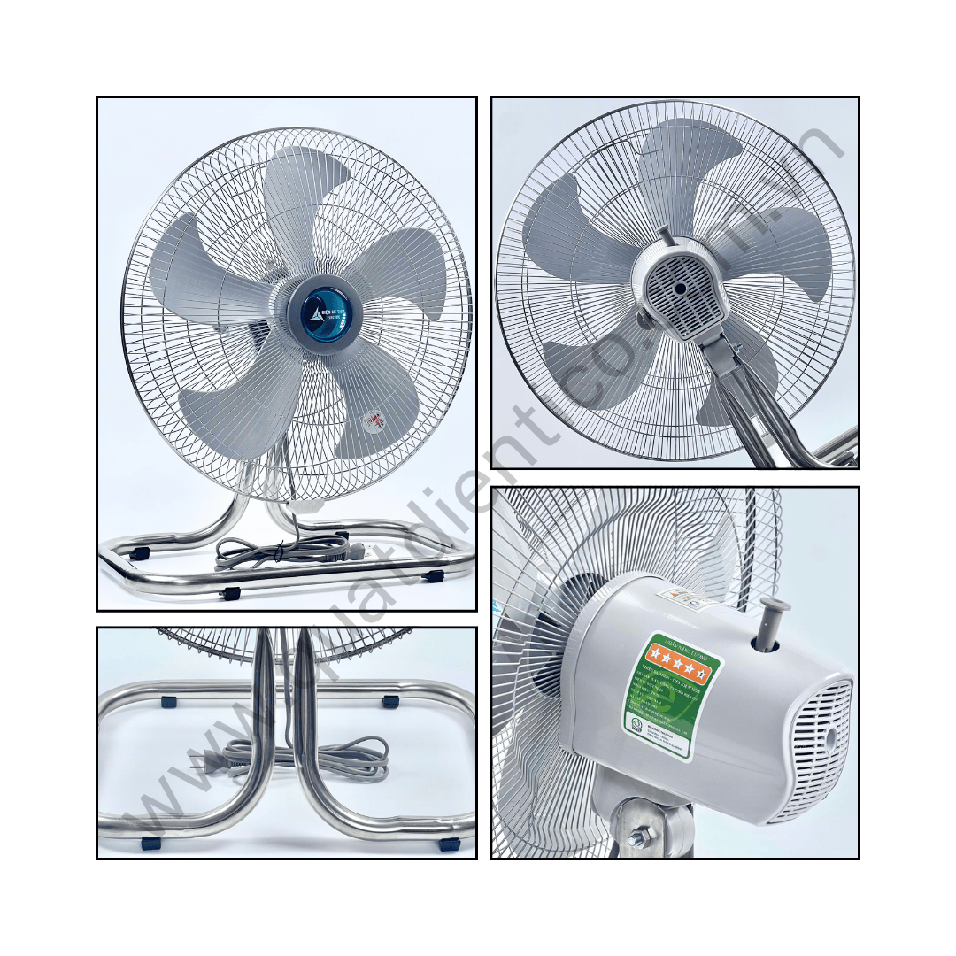 Phần thân quạt được cấu tạo từ nhựa ABS + PP chất lượng cao, có khả năng chịu lực tốt và dễ vệ sinh. Màu xám nhạt mang đến cảm giác trang nhã, phù hợp với nhiều kiểu không gian như phòng khách, phòng làm việc, khu vực lễ tân hoặc cửa hàng dịch vụ.