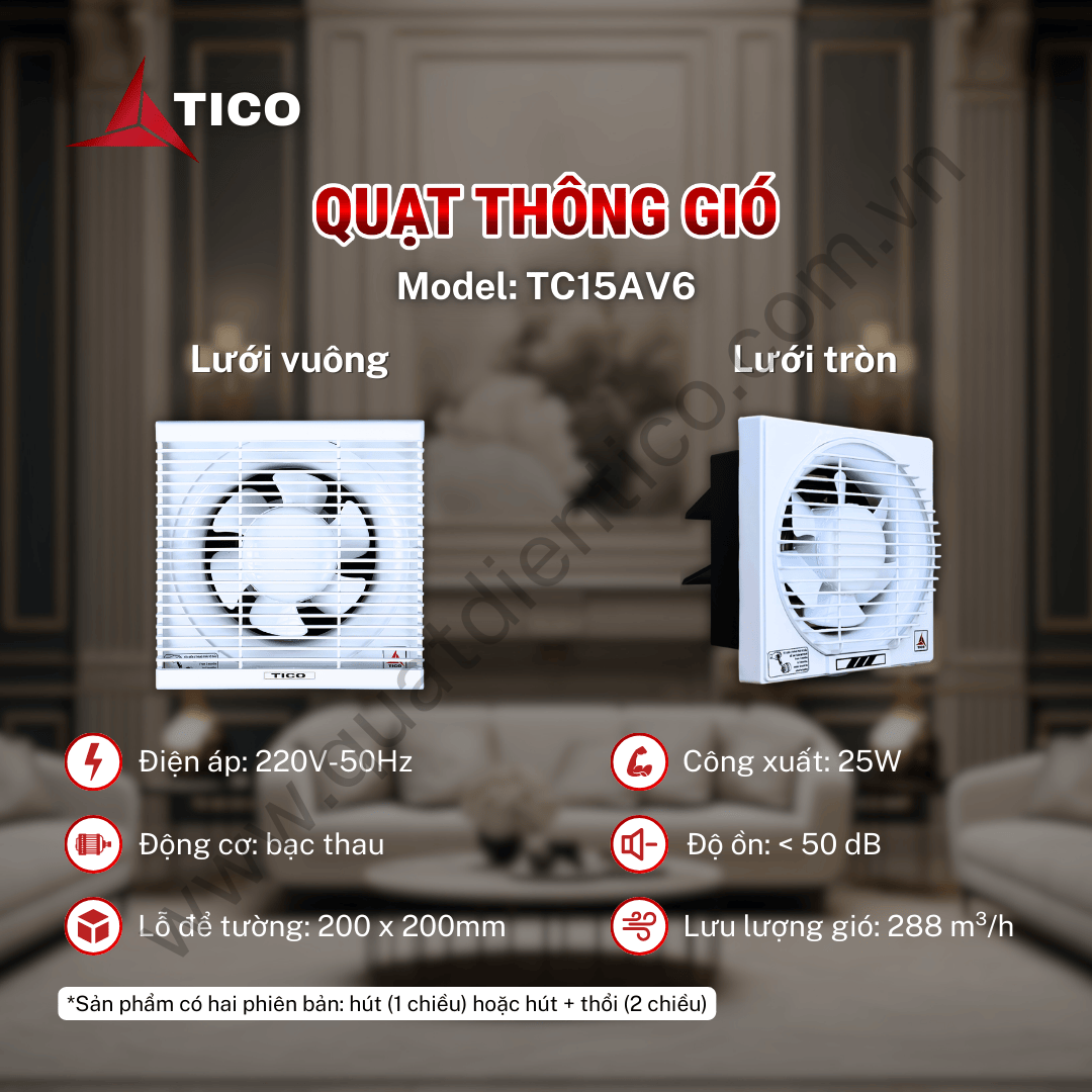 - Thông gió gắn tường TICO TC15AV6 là mẫu quạt thông gió gắn tường nhỏ gọn, phù hợp cho các không gian gia đình và phòng nhỏ cần hút ẩm, hút mùi thường xuyên.