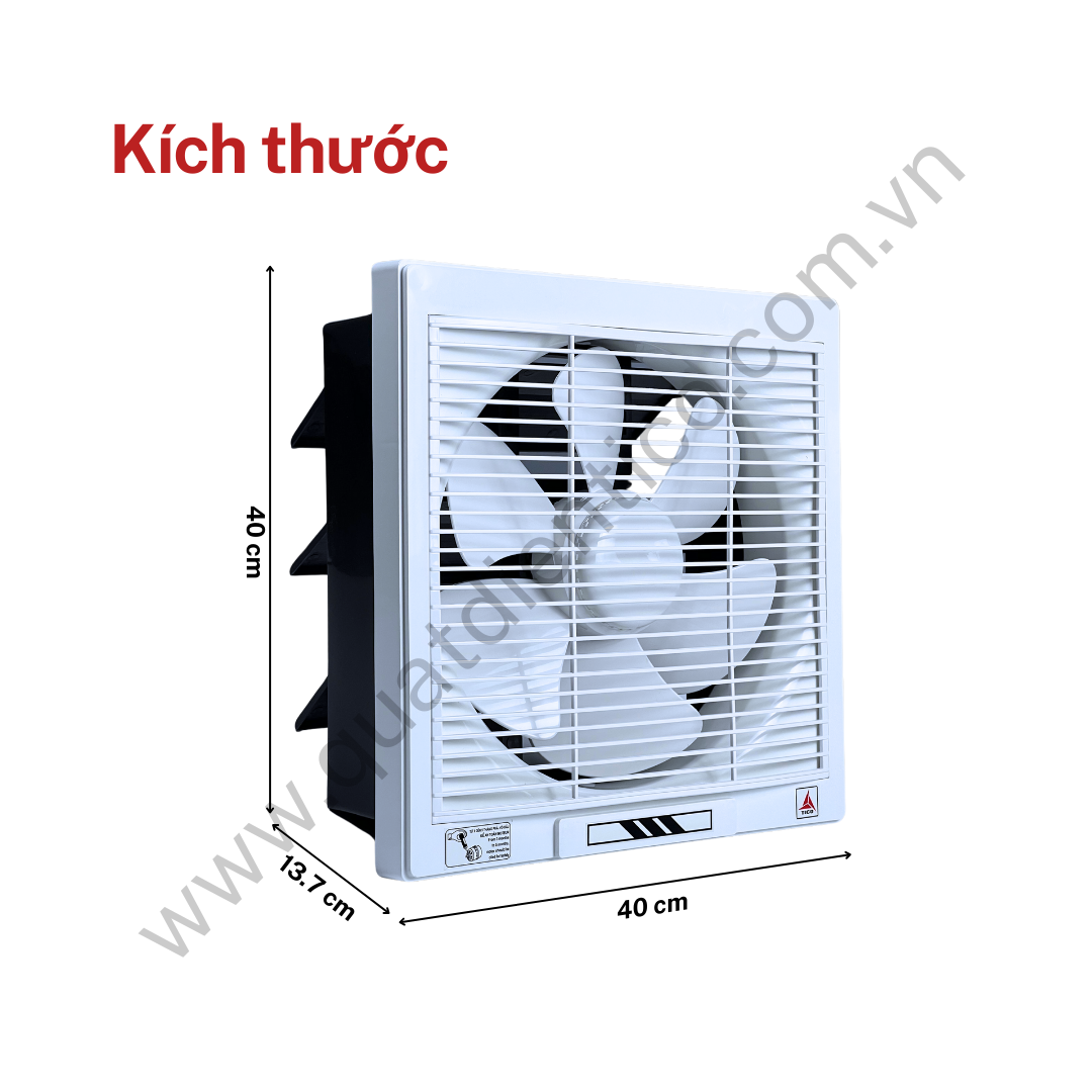 Kích thước lỗ chờ 350 x 350 mm và kích thước mặt 400 x 400 mm phù hợp với tường lớn, tường bê tông hoặc tường gạch dày. Sau khi lắp đặt, mặt quạt phía trong phòng tạo điểm nhấn rõ ràng trên tường nhưng vẫn giữ được sự gọn gàng.