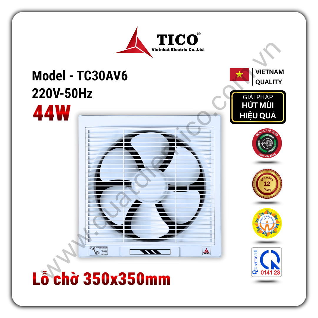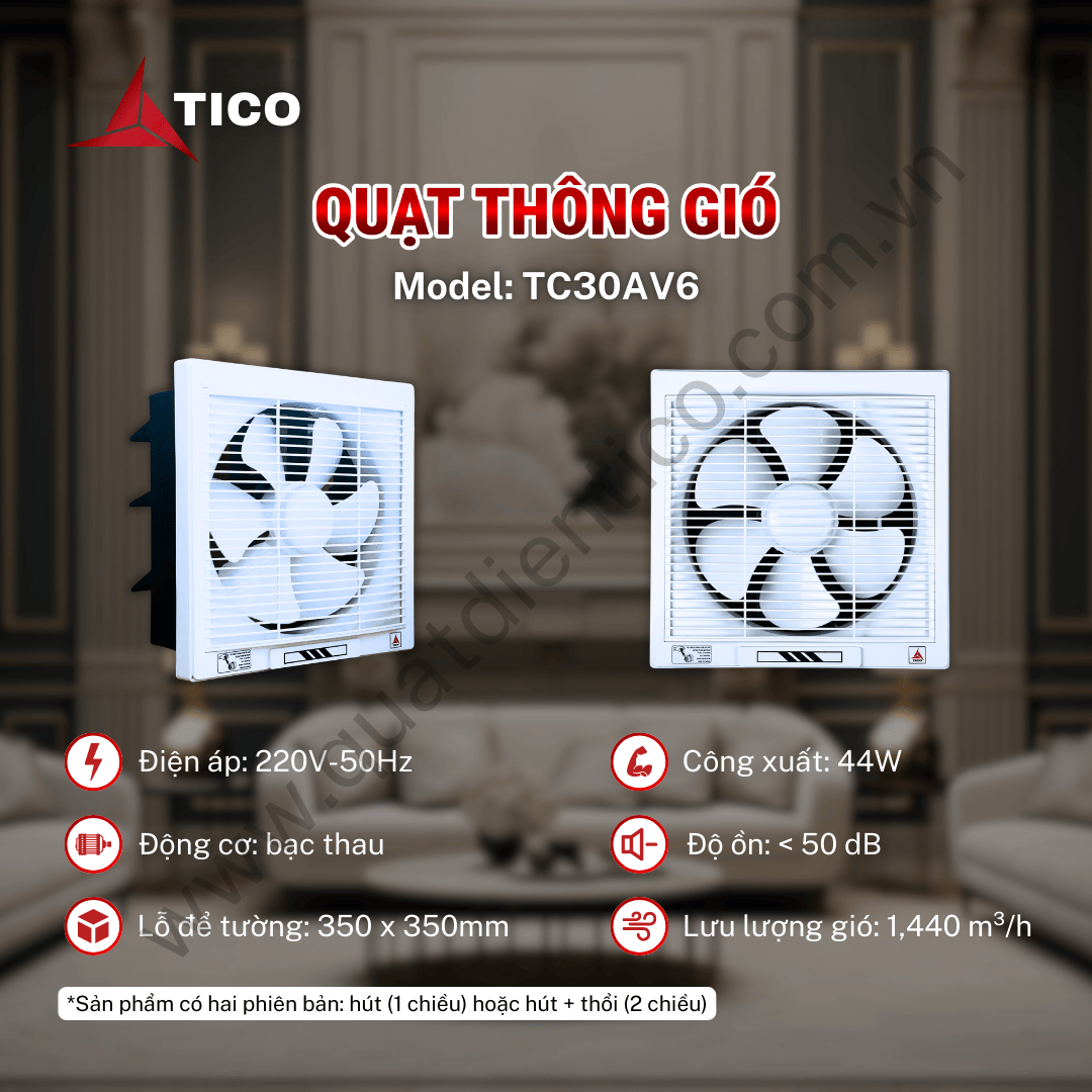 - Thông gió gắn tường TICO TC30AV6 là mẫu quạt thông gió gắn tường lưu lượng lớn, dành cho phòng khách, phòng sinh hoạt, phòng họp nhỏ, khu dịch vụ hoặc không gian tập trung đông người.
