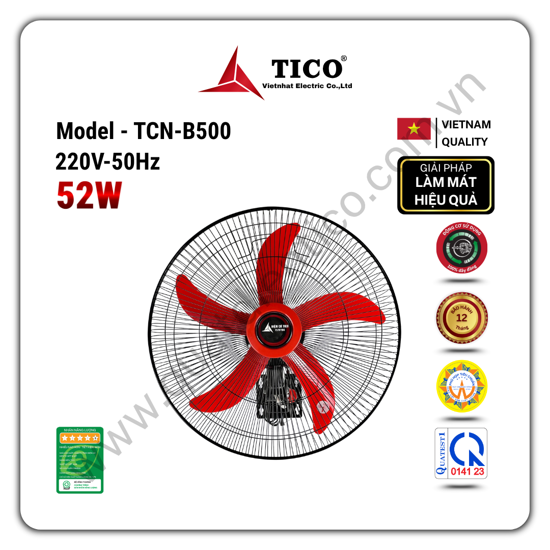 - Quạt treo công nghiệp TICO TCN-B500 là dòng quạt treo tường công nghiệp, phù hợp nhà xưởng, kho hàng, quán ăn, gara, xưởng sản xuất nhỏ.