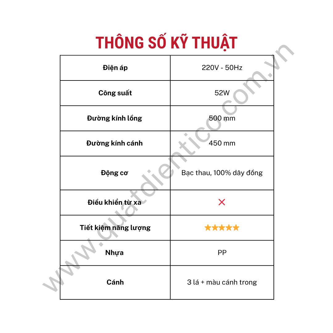 - Đạt chuẩn tiết kiệm năng lượng 5 sao, hỗ trợ tiết giảm chi phí điện khi phải vận hành quạt trong thời gian dài.