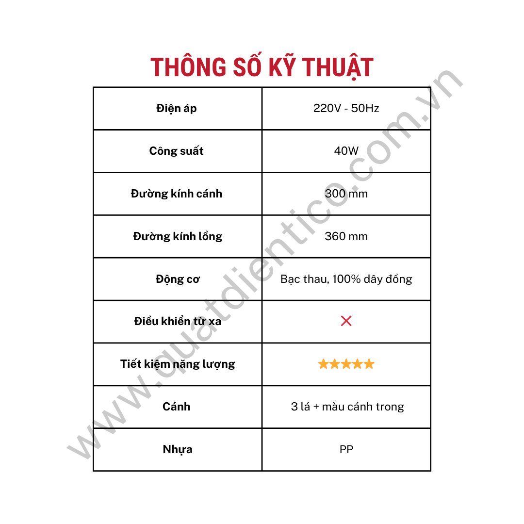 - Công suất 40W, sải cánh 300mm, đường kính lồng 360mm cho luồng gió mát ổn định và dễ chịu.