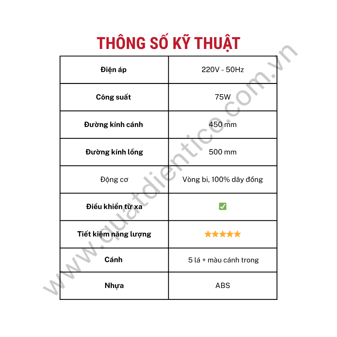 - 🔹 5 lá cánh thiết kế tối ưu giúp gió đều, êm và ổn định, hạn chế rung lắc khi vận hành.