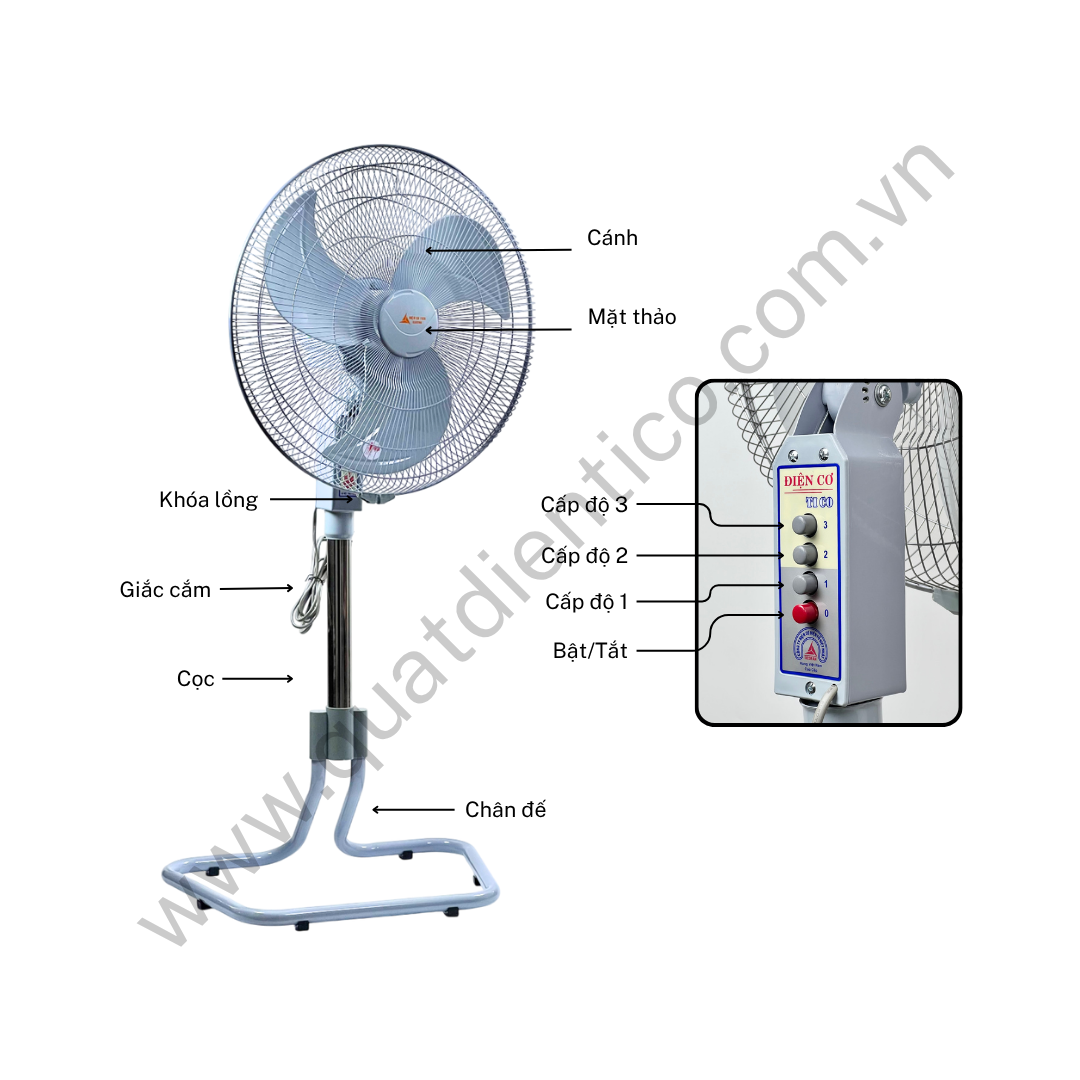 - Chân đế inox chắc chắn, khung quạt vững chãi, hạn chế rung lắc khi chạy ở tốc độ cao, an toàn khi đặt trên sàn nhà trong gia đình hoặc khu vực kinh doanh.
