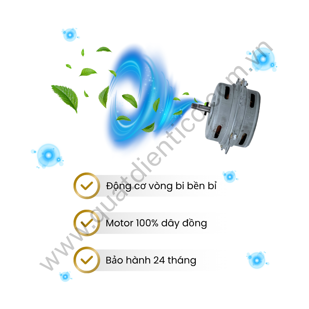 - Động cơ vòng bi, 100% dây đồng giúp quạt chạy êm, bền bỉ, tăng tuổi thọ khi vận hành liên tục.